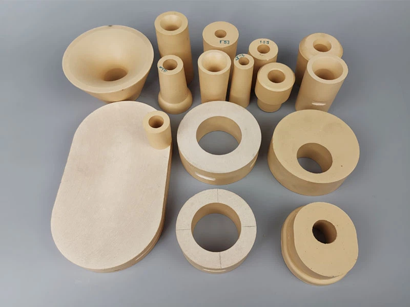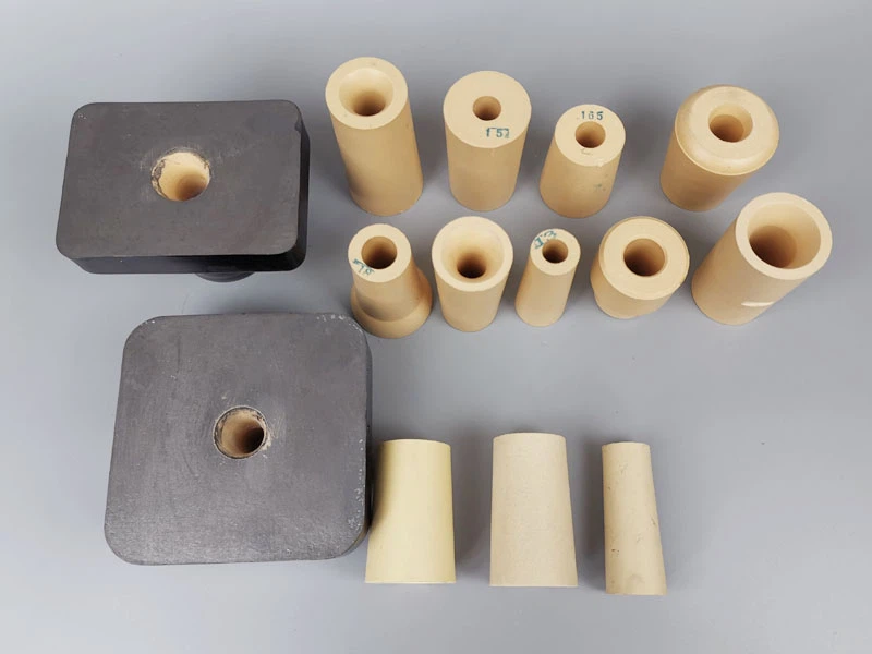 Notre société fabrique diverses buses de dimensionnement en zircone adaptées à la coulée continue de l'acier. Ces buses sont disponibles individuellement ou avec des chemises en aluminium co-moulé. Dans le passé, des buses de dimensionnement en zircone unique étaient souvent fournies, mais ces dernières années, de nombreux clients préfèrent les buses composites dans un souci de réduction des coûts. La buse composite produite par notre société comprend deux types : connexion de ciment réfractaire et moulage par pressage. La buse composite reliée par du ciment est abandonnée par de plus en plus d'entreprises en raison du risque de rupture d'acier. En revanche, dans le processus de fabrication de la buse composite formée à la presse, il n'est pas nécessaire d'utiliser du ciment de jointoiement, mais des inserts et des chemises de presse sont utilisés. Ce mode de fabrication rend l'ensemble du système très fiable sans risque de fuite d'acier entre la partie interne et la coque externe.